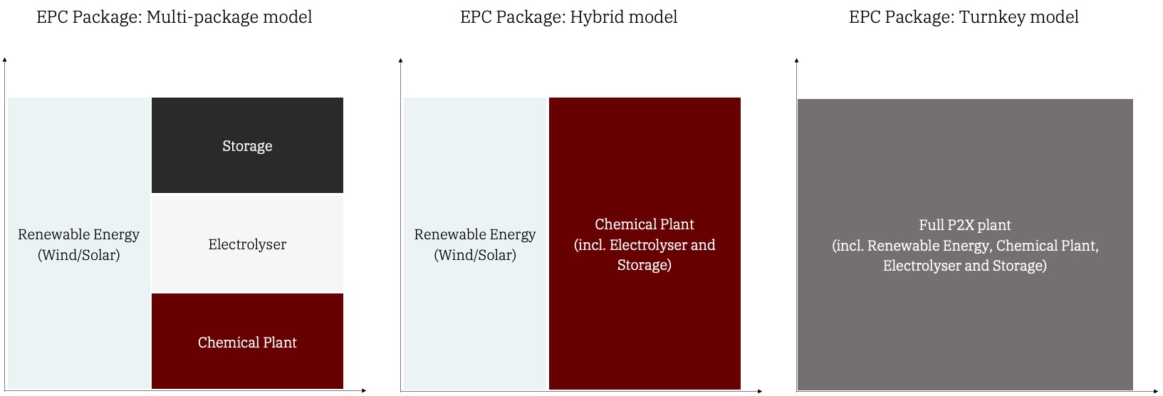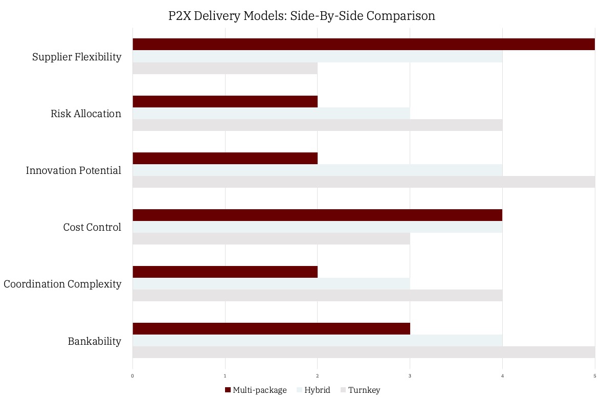 However, turnkey delivery comes with trade-offs. It limits flexibility in supplier selection, can lead to higher EPC margins due to bundled risk, and may restrict innovation by favouring technology combinations already integrated by the contractor. Additionally, the ability to divest all or part of the renewable developments becomes complex in such a structure, reducing flexibility of the project. Furthermore, only a few EPCs can deliver the entire P2X chain under one contract, reducing competition.